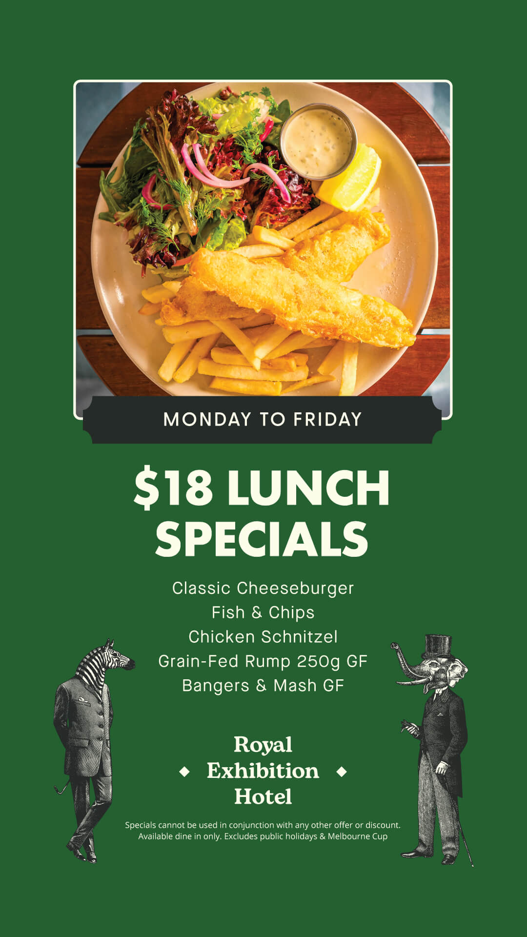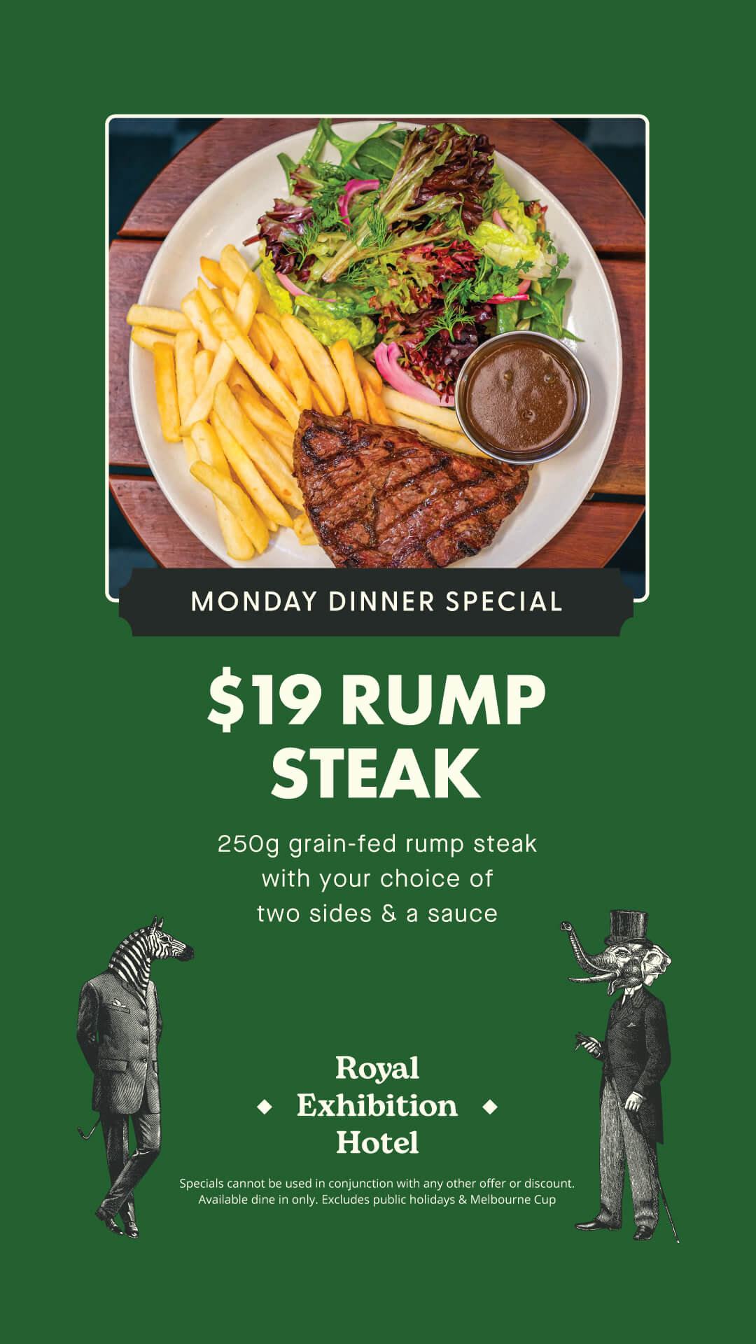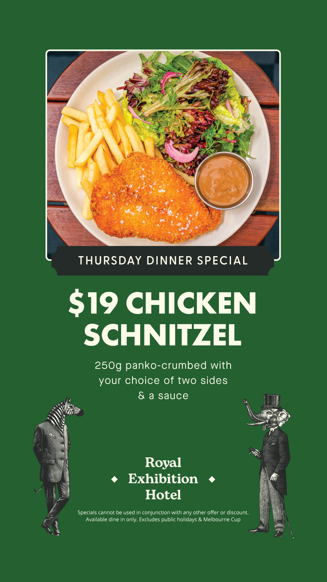 The Royal Exhibition Hotel has proudly curated a modern Australian pub bistro menu celebrating fresh, local ingredients and honest flavours. From perfectly grilled steaks to golden schnitzels, and hearty seasonal salads — our menu is crafted with care and a touch of creativity.
