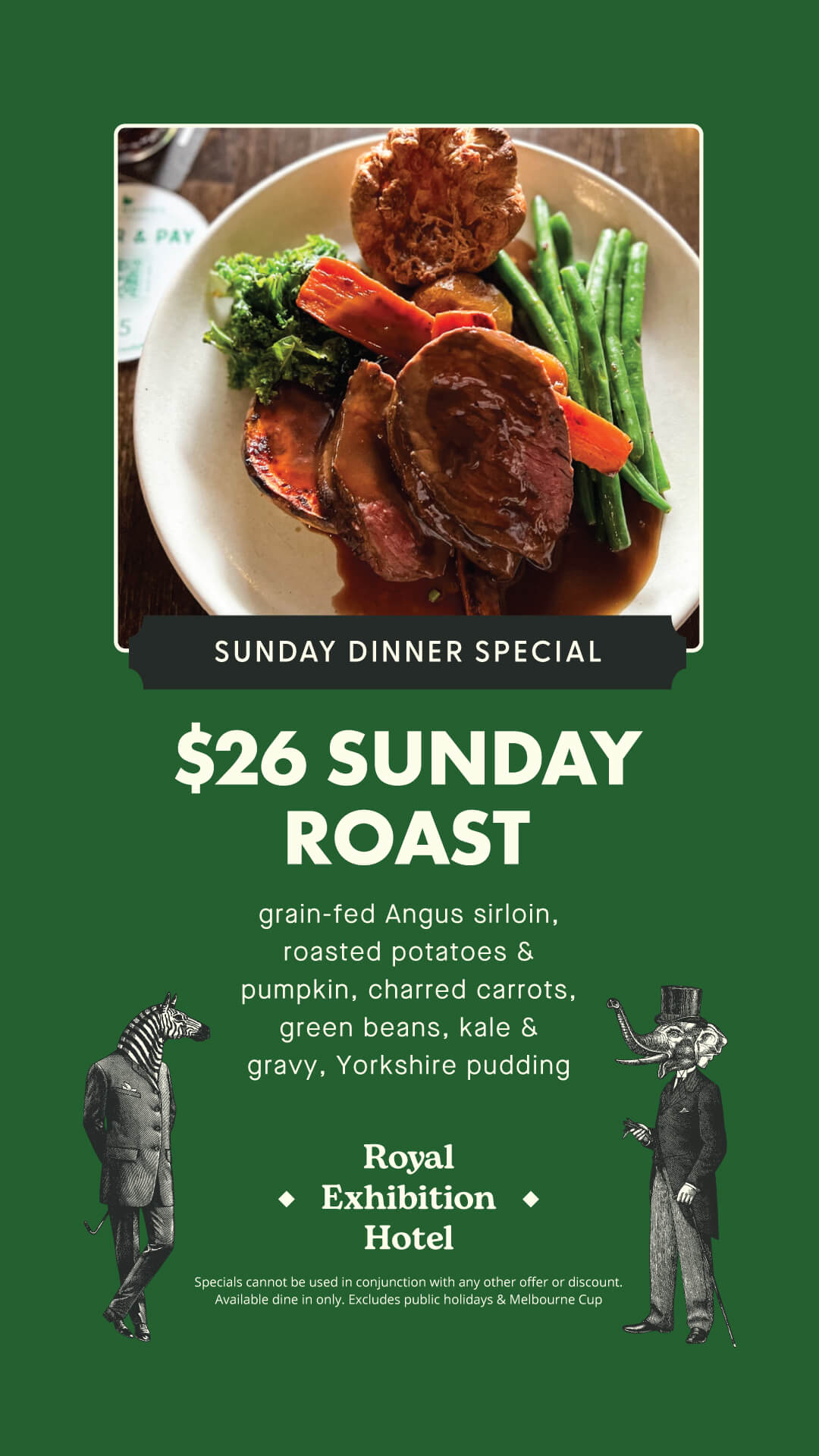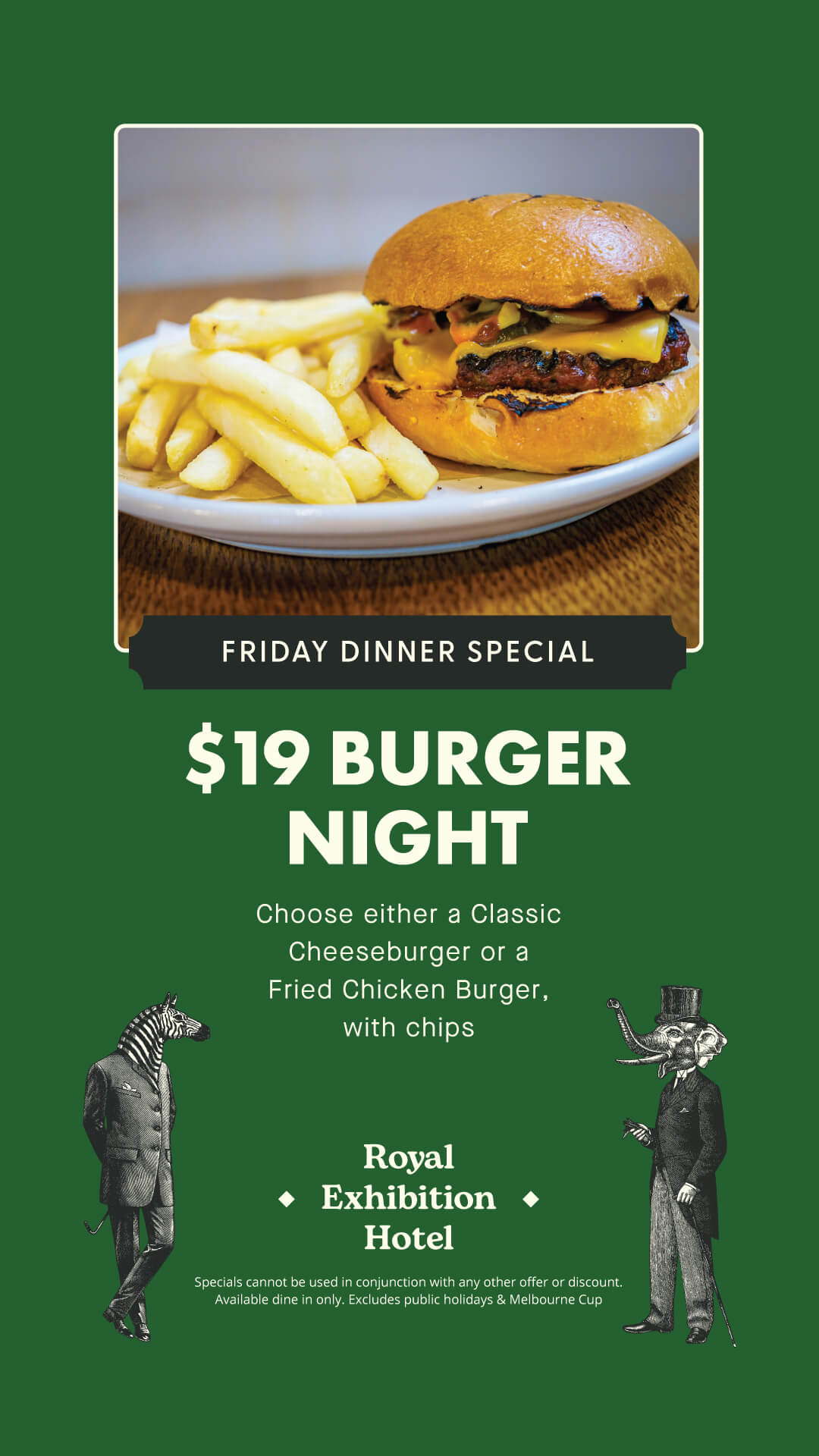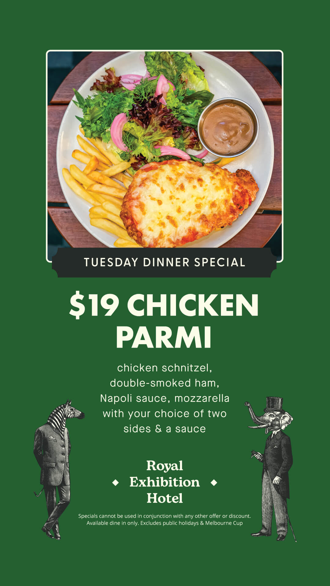 The Royal Exhibition Hotel has proudly curated a modern Australian pub bistro menu celebrating fresh, local ingredients and honest flavours. From perfectly grilled steaks to golden schnitzels, and hearty seasonal salads — our menu is crafted with care and a touch of creativity.